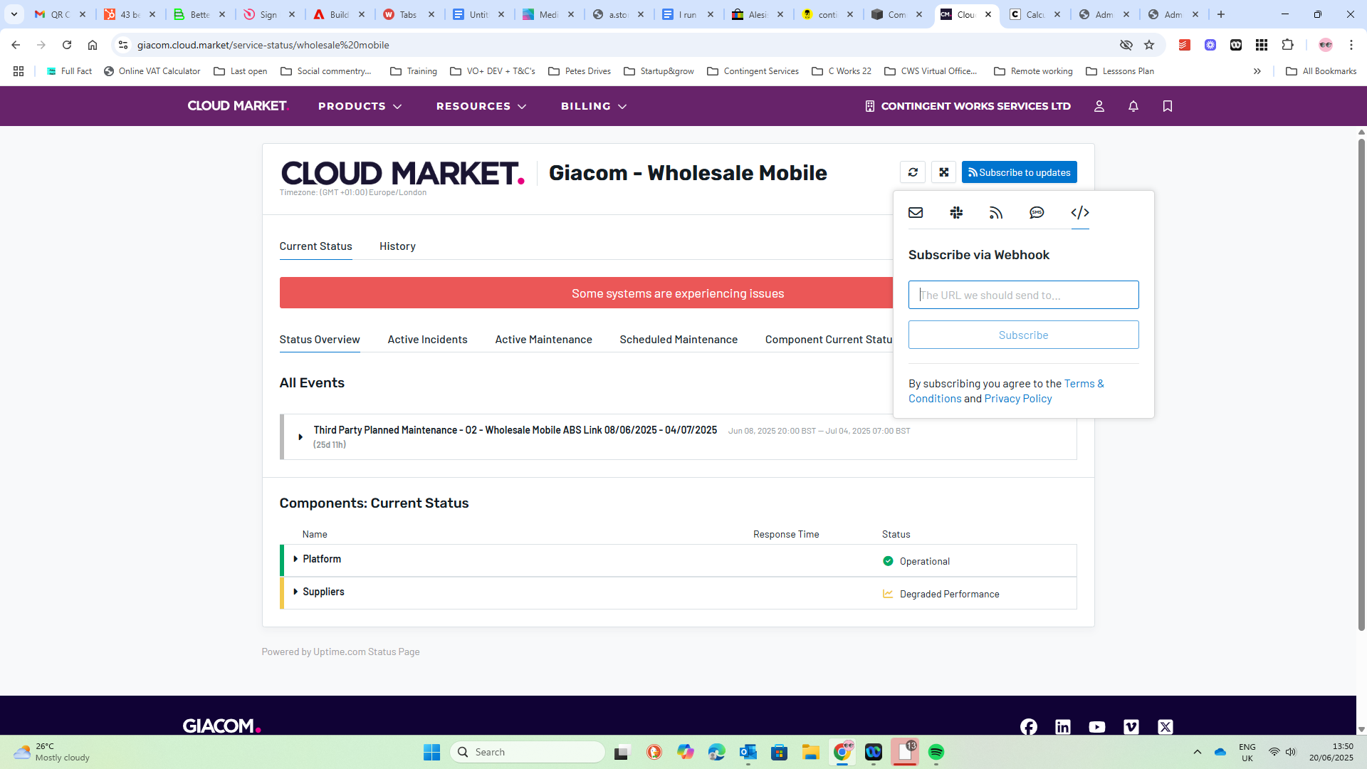Get a feed from giacom to show network and services status on website